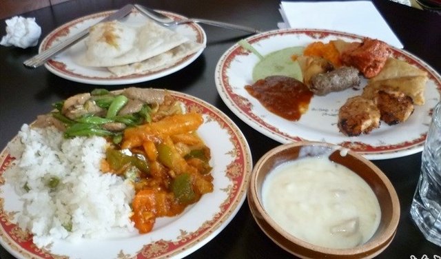 吃的种类比较少,都是咖喱为主。有鸡肉、牛肉和鱼,还有素菜。有3种沙拉,还有西瓜。个人认为咖喱鸡比较好吃。甜点有2种,不知道叫什么名,挺甜挺好吃的。有个辣椒酱,和中国的辣椒酱味道不一样,挺辣的。就是自助餐里不包含饮料,还得单点。