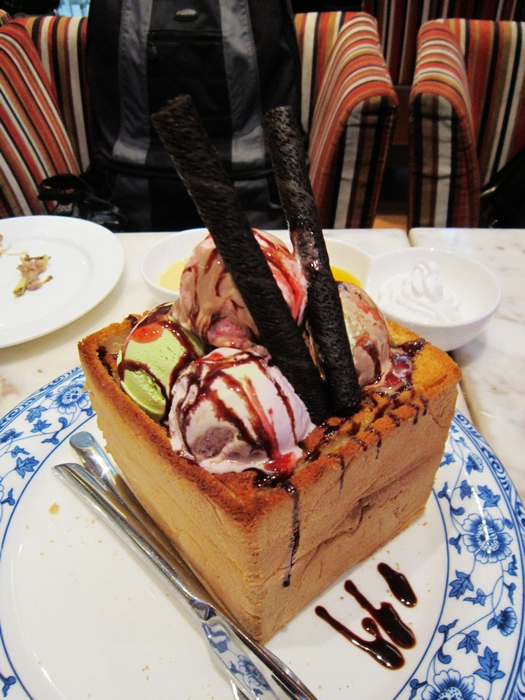 甜品点的是月光宝盒:5色的冰激凌彩球总有一款适合我,炸吐司的脆配上凉凉的冰激凌,整一个爽字了得。