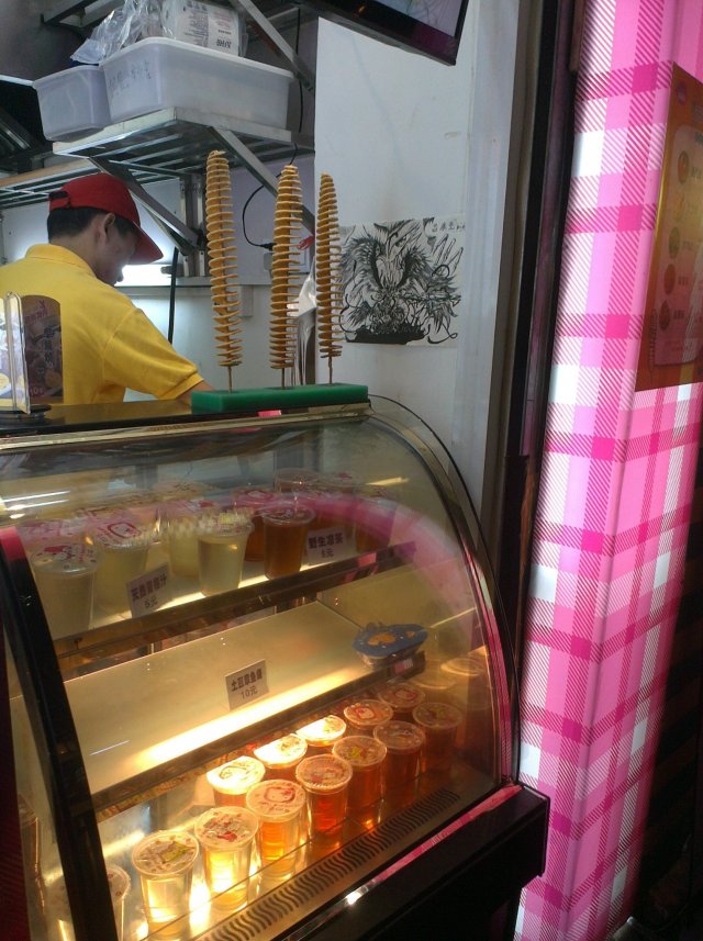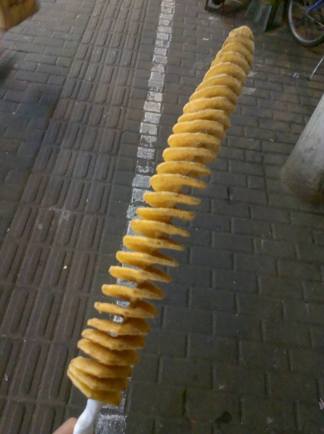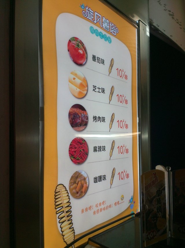 在等着店员帮我制作薯塔的时间里,打量了一下这个小店,店招下的电视里,始终放的是韩国时尚歌舞,让我猜测这种土豆的新吃饭,应该是缘自韩国吧。