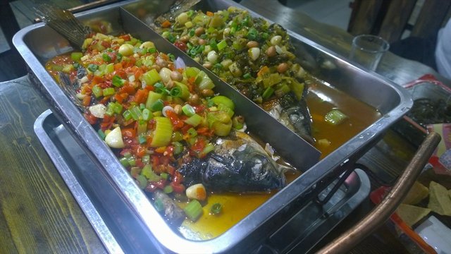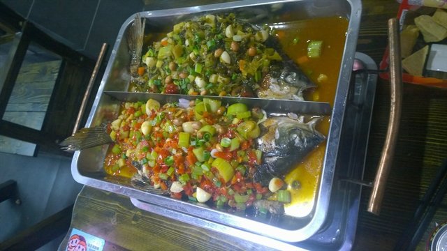 等了一会吧,不是特别久,我们的鱼就上来了,而且这分量不小,不会因为团购缩水,而且两个味道的看起来感觉更多(视觉),只是这个大夏天烤着炭也是真心的热啊,凉快或者天冷吃应该更不错
