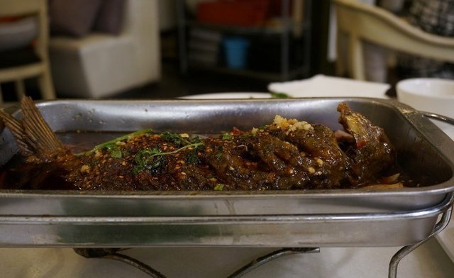 位于大悦楼六层。主营贵州菜系。推荐个硬菜--炝锅鱼。外形像是烤鱼,但仔细观察和尝上去的口感上应该是先炖,然后装撒上辣椒面、蒜沫后淋上热油。口感是酱香味为主。椒香爆牛蛙,椒香有,但不辣。还是酱味为主爆炒,牛蛙很嫩。关键要说配的这个黄瓜,衬着爆炒的酱味中有点黄瓜的清香,就不显酱味的厚重。傣味烤五花肉,带皮五花肉,烤的肥肉晶莹剔透,肥油都已烤出去了,瘦肉不柴,肉皮软糯。白嘴吃味道就很好,我觉得不蘸配的汁好吃。当然酱汁本身没有问题,只是蘸汁掩盖了肉本身的香味。人均80多元。
