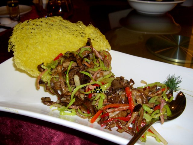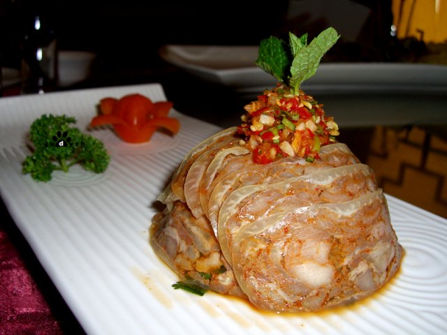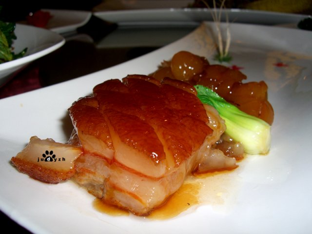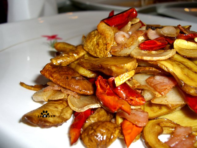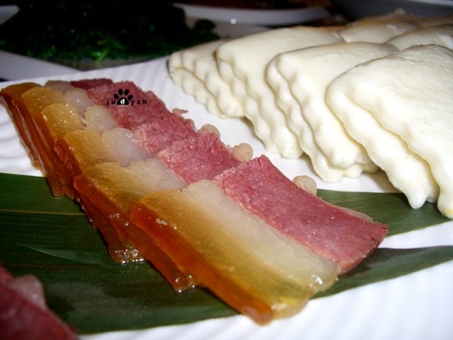 这就是《舌尖上的中国》所记录的诺邓火腿,云南著名特产之一。一端上来就馋坏大家了,金黄色的皮,乳白色的肥肉,玫瑰色的瘦肉,层次分明,太漂亮了!皮已经风干成胶状,比较有咬劲,肥肉的油也耗下去了,一点儿都不腻,用小饼一夹,真不是一般的香啊!(边写点评边咽口水ing)