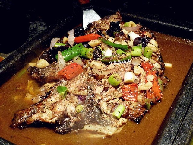 看了下菜单,发现又出了新的口味,【黄金酸辣味烤鱼】!喜欢尝鲜的胖酱自然要点这个味道啦!至于鱼的品种,更加没的说,必须是刺少柔嫩的黔鱼!很快鱼就烤好端上来了~首先其鲜艳的颜色就非常刺激味觉啊!尝了一口,应该是酸辣的刺激,觉得鱼肉非常鲜美!小伙伴们也非常喜欢这个味道,于是很快就把这条烤鱼瓜分完毕了!太厉害!