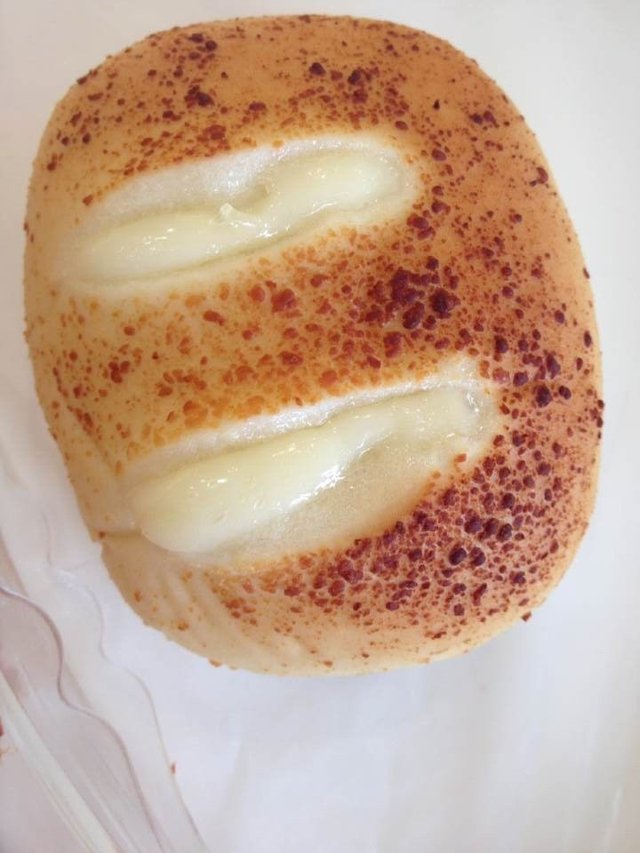 这个帕米森芝士火腿也是新品,一个圆四方型胖墩墩挺好玩,面皮上割开两道小口子里面的芝士酱汁都涌出来,这款面包特别柔软,偏甜的面包卷着咸味火腿,特别是吃到中间部分的芝士,和火腿的烟熏味超级搭啊,这一款味道不错。