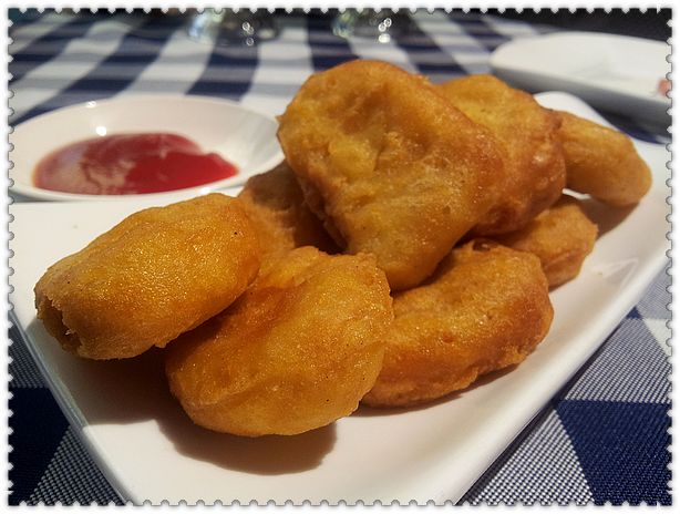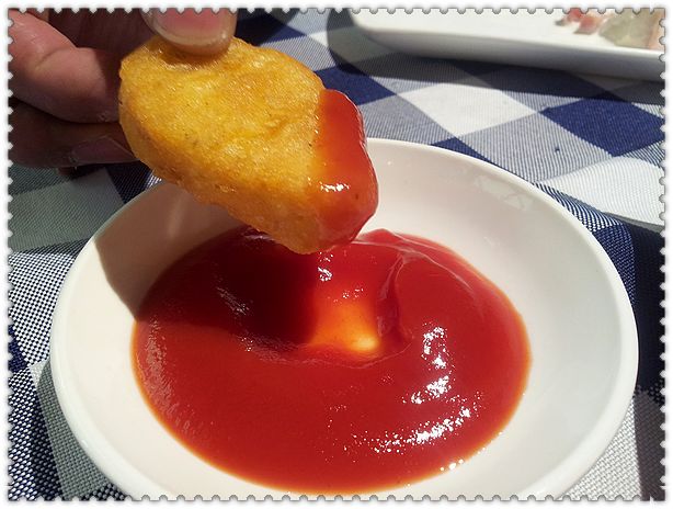 盐焗鸡块~ 老公就喜欢吃这个,平时也会常买来半加工的那种,回家一炸就可以了~ 鸡块 味道也是很普通的~ 这种炸制的东东一定要趁热吃,否则外皮就不脆了~ 可能是因为沾酱的原因吧,他家用的是番茄沙司,我们自己在家用的是泰式甜辣酱,更提味吧,所以觉得不如我们自己在家里弄得好吃呢,呵呵~