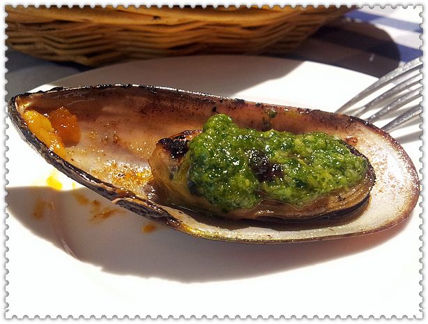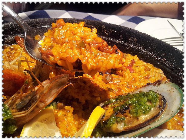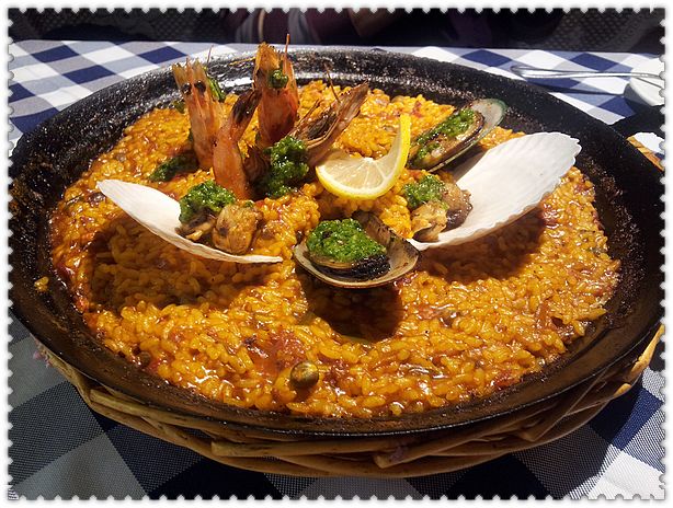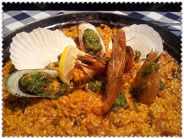 是一直很大的平底锅,米饭油润润的,呈金黄色,放入的海鲜有2只扇贝,两个海虹,3只海虾~ 还有一种绿色的调味料浇在海鲜和米饭上,味道是咸的,难道这就是那个巴西里末? 据说西班牙海鲜饭要放入藏红花才会有独特的香味,但是这个食材比较贵,大概一般都不会放的吧~~