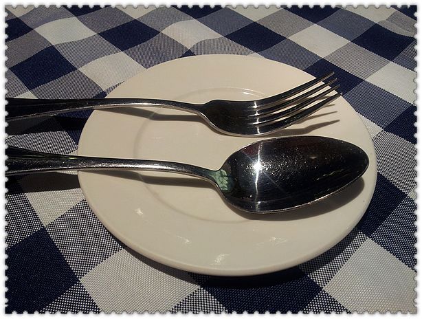 洁白的餐盘和明亮的刀叉,简单的餐具~
