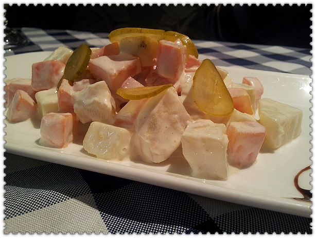 俄式土豆沙拉~ 土豆丁、胡萝卜丁、火腿肉丁拌上沙拉酱,再配上几片酸黄瓜而已,很普通~ 味道偏淡,不过对于喜欢吃沙拉的我,还是津津有味的全部吃掉了~