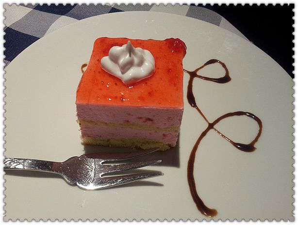 最后是甜品,草莓慕斯蛋糕~ 很小巧的一块,不过从外观到口味,都没有精致的感觉~