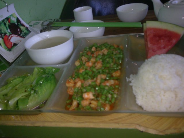 咖喱虾仁一份,配送一碗白米饭,一份生菜,一碗党参凤爪汤,一份水果