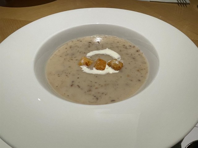 餐汤是法式蘑菇汤,我以为是像金宝汤那种,结果是有蘑菇蓉的,不是敷衍煮的汤,毕竟我也是会做饭的人,这个汤我敢肯定不是罐头汤。蘑菇味够香浓,分量也不少,不是真正法国那种,盘子大,汤两口就喝完了;