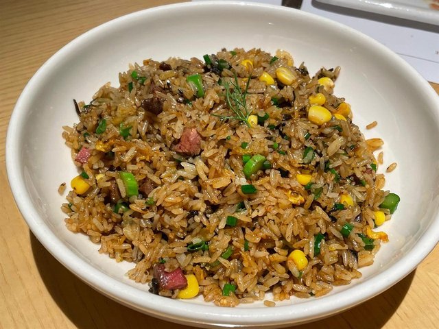 当我以为可以松一口气时,又来了一碟炒饭!我没留意套餐里有炒饭,看到饭的时候真是愣住了,吃完牛排已经很饱了,但看到炒饭炒得这么漂亮,不能浪费不吃吧!最后是榄菜牛肉粒炒饭,米饭炒得粒粒分明,也不会太硬,又够锅气;牛肉粒也煮得刚刚好,一点都不会柴,同样有牛味;