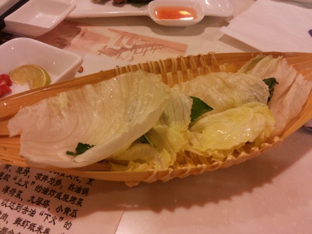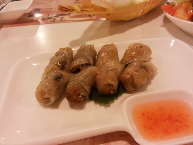 越南炸春卷,之前朋友推荐的一道菜就是这个,所以我对这道菜的期望值特别的高,需要搭配菜叶吃,我最讨厌吃菜了- -觉得吧挺一般的,有些酸酸的味道,不知道里面放什么了,不过这道菜还是给吃光光了。