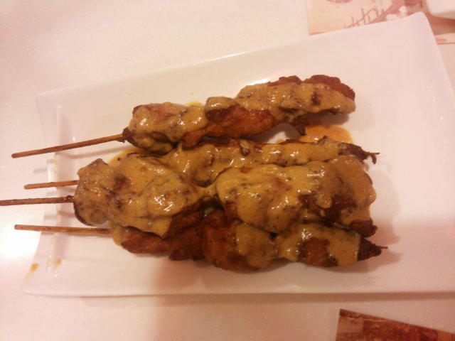 沙嗲串烧鸡肉,虽然这是一道极其一般的菜,不过我个人来看觉得还成,因为对比之下就这个算是大肉了,肉串上面有酱,不知道是什么酱,这大串吃起来很带感啊~~就是凉了的时候吃起来不爽。