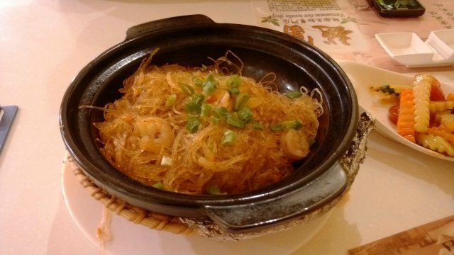 接着是虾仁粉丝煲,这道菜还是挺好吃的,黑胡椒口味,大虾仁也是清晰可见,美中不足就是上来一定要马上拌天,要不全糊锅底了.