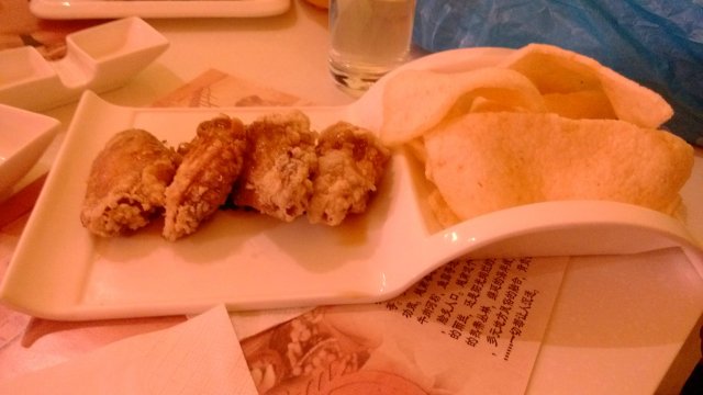 最后一道换的菜鸡翅上的挺慢,一份就四个鸡翅,一人吃一个,说实话,味道非常的奇怪,好像是一种特别的香料吧,中国人吃不习惯,虾片也是干巴巴的.