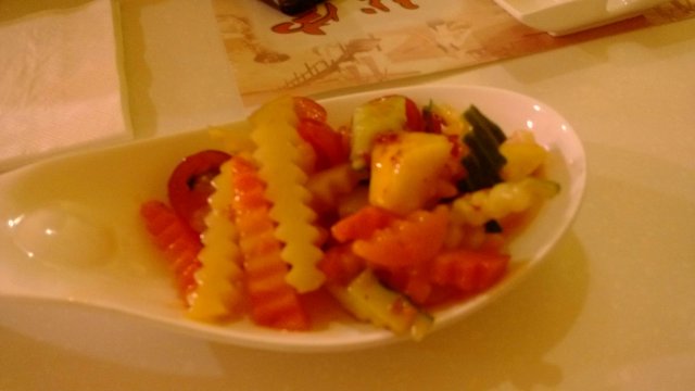 上菜餐这前选给了两杯柠檬水,大冷天的喝了挺暖身子的,菜上的还算快吧,第一道是冰菜,什么蔬菜沙律,就是有几样青菜和水果用花刀切成条,然后拌的辣酱,酸甜可口,挺开味的