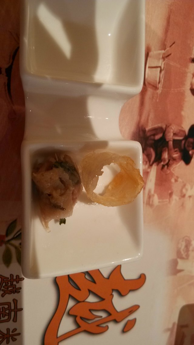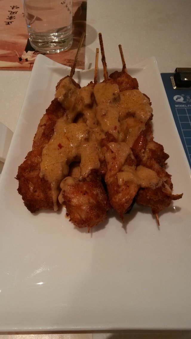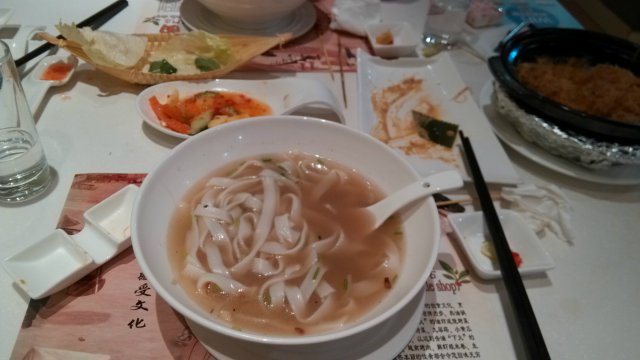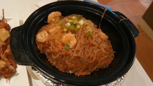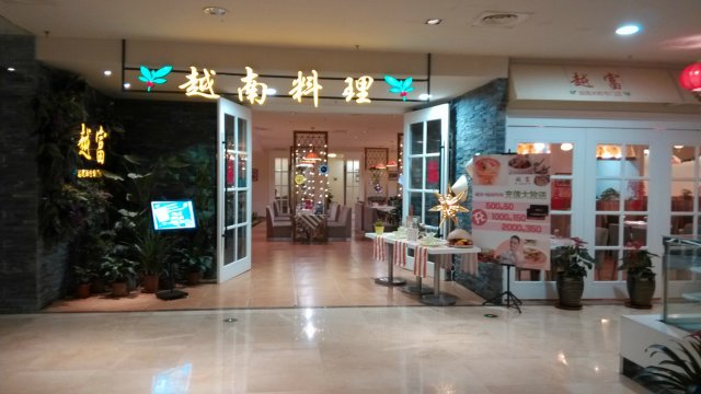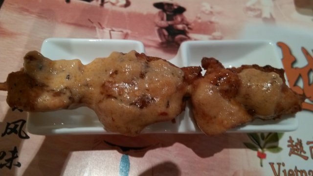 网上团购的58元双人套餐,还没尝过越南料理,听说这家的厨师是越南当地人。它家在中街商业城的五楼,在冰场旁边就是,门口摆着一张桌子,上面有红酒、杯子和碟子还有水果篮,不过是用来装修用的,让人看了比较有食欲。已经是晚餐时段了,但光顾它家的食客非常少,整个店内上座率不超过5桌。店内装修比较简洁,比较低调又不失典雅,隔栏上挂着几只QQ的玩偶,整体显得很干净,就是太空了。吧台在餐厅的中央,大概一共有4个服务员,三个女性,一个男性,还有一位男性好像是老板,也不时的帮忙传菜。上菜前,每人赠送一杯白水,上菜的速度很快,不到5分钟就上全了,一共5样菜。先上的一个匙子模样的碗,带个把的,里面装的是蔬菜沙拉,不是沙拉酱,是用泰式的甜辣酱拌的,里面有黄瓜、圣女果、土豆、木耳、胡萝卜,胡萝卜和土豆做的太面了,吃的有些不习惯,吃着有点辣,感觉没有沙拉酱拌的好吃,而且量不多。一盘鸡肉串,一共四串,肉块很大,应该是先炸后烤的,因为油份比较多,而且外皮有点烤糊了,有点脆,鸡肉很嫩,还带点鸡皮,味道比较淡,主要的味道来于抹在肉串上面的酱,说是店内自制的沙爹酱,里面放了不少的花生酱,味道很浓,虽然表面有点辣椒,但口味不辣不咸也不甜,有点香,肉串抹着这个酱很好吃,不过吃多了会有点腻,鸡肉串很劲饿,全是肉啊。一小盘的春卷,个头很小,外皮过油炸的很脆,比较干,热的时候吃还可以,凉了就不好吃了。吃时是沾着甜辣酱吃,甜辣酱兑过水了,很稀,春卷还配有几小片的生菜叶用来卷着吃。里面的馅有虾仁、紫菜和肉沫,味道一般般,感觉没什么特别的,就是外皮太油了,不过外皮和里面的馅很容易分离开,可以不吃。黑椒虾仁粉丝煲,是一个砂锅里面大部分是粉丝,还有几个中等个头的去皮虾仁,虾仁味道很淡,几乎没什么味,不过很新鲜,粉丝特别的干,底下的粉丝已经粘到了锅壁上,而且口味比较辣。招牌生牛肉米粉,应该属于米线类,不过形状是扁平的,有点像面条,很软,也很滑溜,汤味道比较淡,吃的时候配有一小块柠檬,说是可以挤到汤里面,柠檬特别特别酸,是那种青柠檬,不过挤到汤里后感觉没什么变化,米粉里有两块个头比较大的冬瓜,要是切成小片就好了,吃着比较费劲。牛肉是那种涮火锅的肉片,很少,差不多5片,米粉是整个套餐里唯一一个有水价的,其它的菜都太干了。整个套餐以辣口为主,甜辣酱为调料,桌上还备有一瓶甜辣酱,可惜我吃不惯。