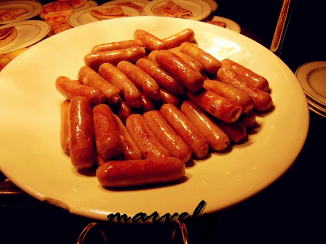 烤物有香肠、披萨和飞饼。飞饼很普通,里面没有香蕉。香肠吃起来很嫩,但是即便上面有撒过胡椒粉的痕迹,味道仍旧是有些淡了。
