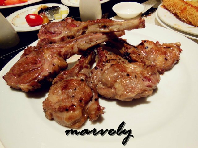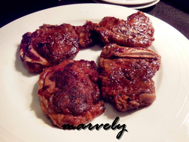 烤羊排,羊排肉比较厚,所以在铁板上烤了同样5分钟左右的时间,看起来连5分熟都没有。羊肉还是比较嫩的,但是这羊排事先应该是没有腌制过的,所以味道都是上面撒的胡椒粉的咸味。