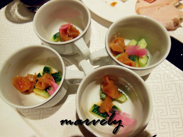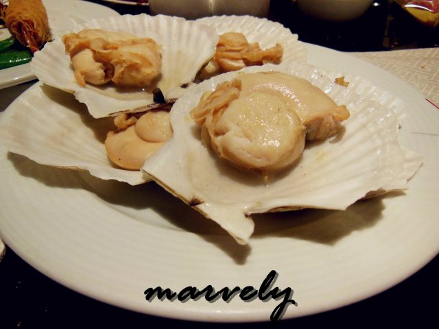 海鲜冷盘里有基围虾、素鲍鱼、梭子蟹和扇贝,个人觉得扇贝比较好吃,因为厨师选择的扇贝肉质肥厚,吃起来的口感很充实,加上扇贝很是新鲜,能吃出肉质里鲜甜的味道来。
