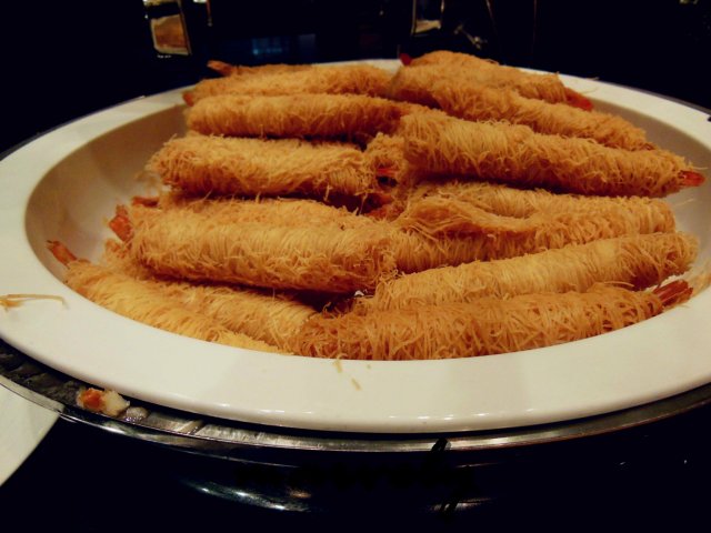 热菜里的炸虾,炸虾的外表,裹着一圈圈的丝丝的酥条,一咬下去,这些酥条就在口中碎成小小的碎块,虾肉是剥了壳的,不过在虾肉上涂的那层淀粉有些厚了,显得虾肉有些细小了。