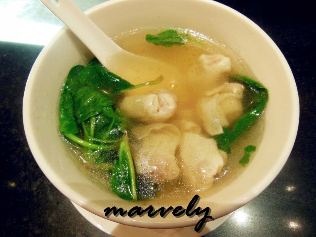 汤面里可以选择小馄饨、鸭血汤和粉丝汤。需要多少的量,直接跟厨师将讲可以了,这里小馄饨里面的肉馅,比一般外面店里的肉多一些,汤汁比较鲜,小馄饨因为肉多,所以吃起来的口感也不错。