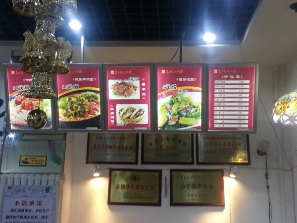 牛肉面是14元一碗,还有酸菜面15元,小菜是5元一份,但是不能拼,有海带,豆皮,黄瓜,素什锦啥的,牛肉是8元一份~~