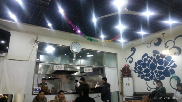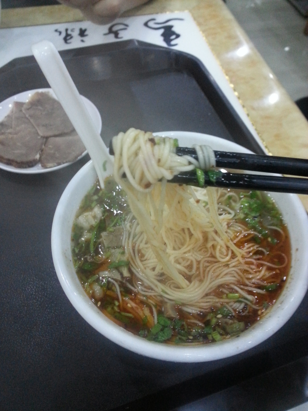 牛肉面是到前面凭条自己取,上过舌尖上的中国就是不太一样哈,面前一大盆子辣椒,看起来很香,都是流水线工作的,面条可以自己选择粗细,有裤袋宽,也有韭叶细,可以自行选择。