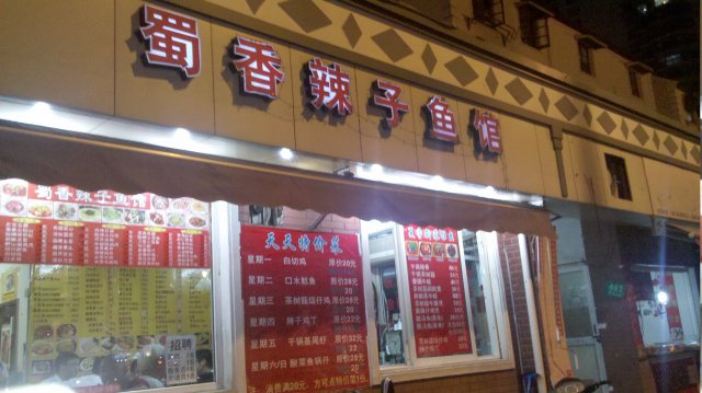 这周五晚上朋友请客吃晚饭,请了我和我老公以及朋友的几个好友,说是聚聚聊聊天吃吃饭。吃饭的地点选在了西藏南路上的一家小饭店。虽说饭店小了点,环境也不怎么样。但是朋友说她经常到这家饭店吃饭,这家的辣子鱼两吃是特色菜。两吃即是用两种做法烧鱼。一种是用辣椒鱼片烧汤,另一种是烤鱼。两种做法都很好吃,鱼片汤很鲜嫩,烤鱼很香。所以辣子鱼两吃必点,还点了满20元的天天特价菜,那天的菜是特价22元的干锅基尾虾,吃了也觉得味道不错。还点了其他很多菜,具体名字我记不清了。反正我对这家小饭店的辣子鱼两吃印象最深刻,正呀。