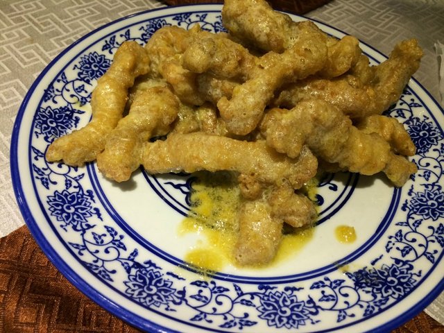 [咸蛋黄排条]32元 上来量还不少。排条的肉很精,只果了一点点面粉。外面再上了曾咸蛋黄。味道好吃,切的很大块