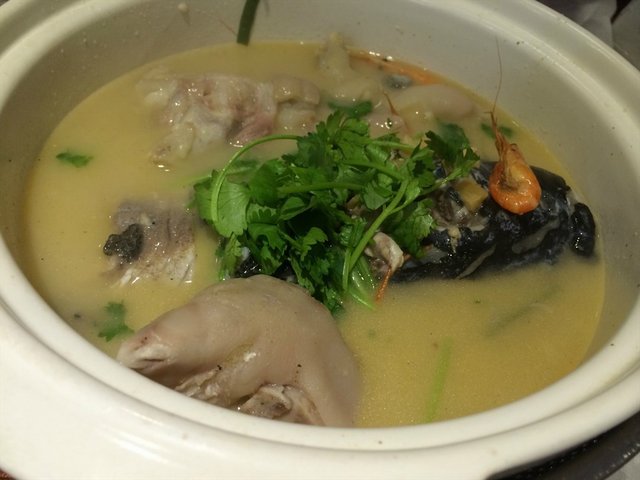 [猪蹄鱼头汤]一份蛮大。老板娘看我们只是2个人,里面的汤很少。还说你们吃完给你们加,吃不掉也是浪费。里面有猪蹄4/5块,鱼头半只。小虾若干。应该是汤炖了很久,有客人来之后额外加入鱼头再煮开。味道很鲜美。汤色有些清淡 额外再加了晚饭