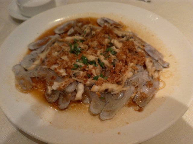 蒜蓉蛏子。加粉丝的,蛏子不够肥美。只能说,蛏子也好,蒜蓉也好,所有的鲜美最后都被粉丝吸收了,不过粉丝太少,大家几筷子下去,就没有了。