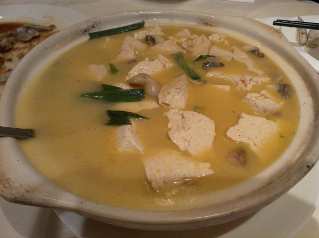 自制豆腐。家里很久没吃过豆腐了,而且看图片上这道菜用的是老豆腐,而且汤水也蛮多的样子,我们就把它当做一道汤点的。菜上桌的时候,我们都惊叹这是多么大的一碗豆腐。汤里除了豆腐,还有少许的肉片、蘑菇和皮蛋。不过这道菜和之前的那道素腰花一样,用的都是高汤,吃起来的味道差不多,只不过好像因为这道汤水比较多,而汤水里的豆腐也比较多,所以鲜美程度上比上一道稍微逊色些。老豆腐本身很能吸收汤汁的味道,所以豆腐吃在嘴里,一咬就是一泡鲜美的汤汁蹦了出来,颇有些意思。但是豆腐太多了,吃到后来我们都没有吃完。