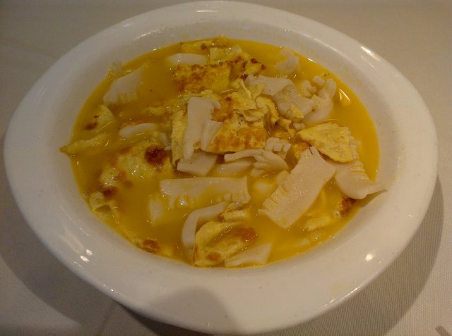 煨素腰花。腰花是用豆制品做的,嚼起来很脆,有了腰花的脆,却没有 腰花的嫩,和被做成蛋皮的鸡蛋一起浸渍在高汤里,汤汁应该是熬煮过的高汤,很是鲜美,给蛋皮和腰花加分不少,我们后来都是只要喝汤不吃菜了。