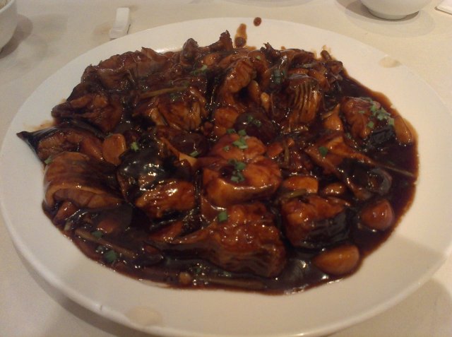 红烧蒜枣回鱼。这是我们至此点的重头菜,不过很奇怪他家人不锁,上菜却是很慢,最后这道回鱼,还是我们前面几个菜都吃的差不多,催了好几次才端上来的。不知道是不是我们脆的太急了,这道回鱼上来的时候,竟然带着浓浓的灶台气,让我们都怀疑他家后厨是不是煤气泄漏了,虽然鱼肉真的很嫩滑,鱼皮很有质感,但是吃起来不免总觉得那里不对劲。所以这道重头菜,免不了的被打了折扣。