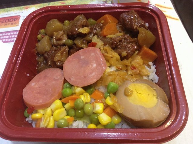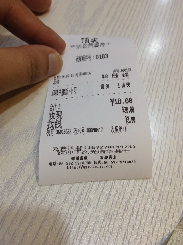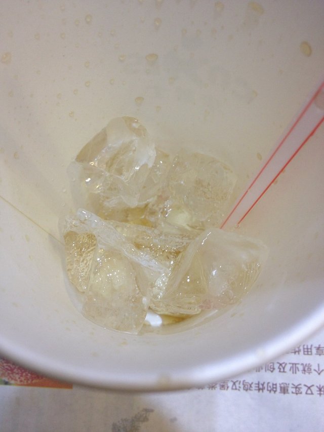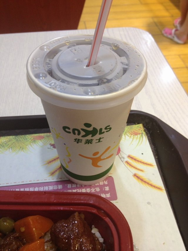 换了个麻辣牛腩饭,要价18元,菜单上写的是配汤或者果汁,可这里两种都不提供只供应可乐,对服务员说可乐不加冰,被她横了一眼转过去往杯子里装了半杯冰块再从机器里接了一点可乐,插上吸管一口就把可乐吸完,剩下半杯冰块。