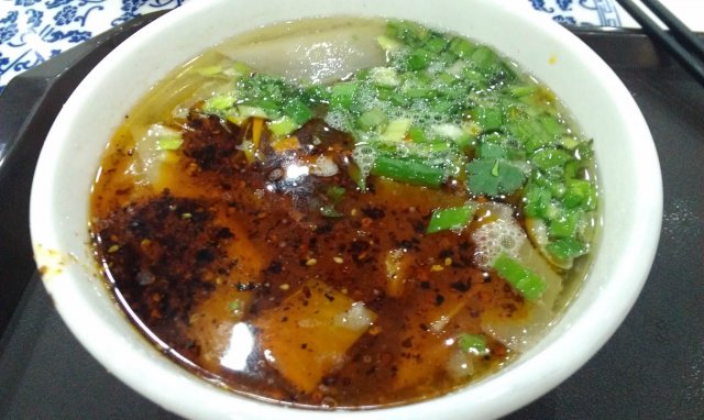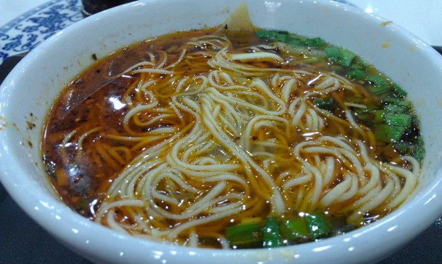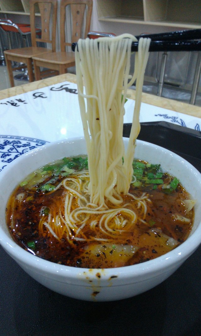 牛肉拉面君登场,10米一碗,量对于女生和食量较小的男生来说足矣。辣油看起来就很霸气,不过吃起来并没有想象中的辣,只是提香而已。刚端上来时香气就已经很足了,食欲蠢蠢欲动咩~面条比想象中的要细,看起来有点委婉,少了西北人特有的豪爽劲儿。口感还是很劲道的,也不至于到不好嚼的程度,软硬把握得恰到好处。牛肉是切成颗粒状的,给的不多,省在口味还不错,瘦肉不塞牙。但是这货居然只放了葱花不放香菜,香菜控伤不起。
