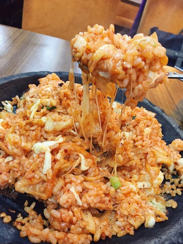 芝士泡菜炒饭,26米。看是新品才点的,各种团购网的首页推荐图都是这个,估计味道错不了。比普通的泡菜炒饭少了煎蛋,多了很多芝士。泡菜酸甜口儿,混合着米饭不会太辣,加上马苏里拉芝士,趁热搅拌均匀后,拉丝效果简直棒极了。分量也很足的说,拌来拌去也是种乐趣。铁板温度比较高,吃的时候从头到尾都可以保证这种温度,设计还是挺人性化的。