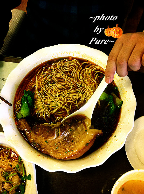 等我们吃得差不多才上了大肉面。大肉面里面有块奇大无比的肉。都是肥肉。看起来很油,就挑着精肉的部分吃了。汤头说是中辣,不过没有酸汤肥牛那么浓郁。吃过酸汤肥牛这个就很逊色了。汤头就是普通的红烧牛肉面。后来我们直接把面拿出来放酸汤肥牛的汤里吃了