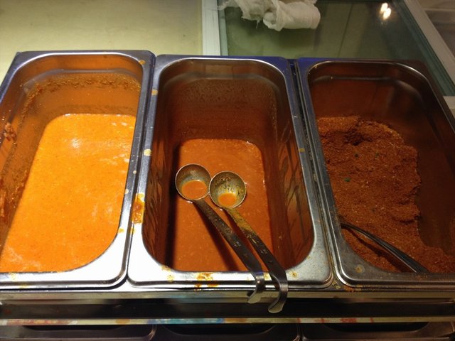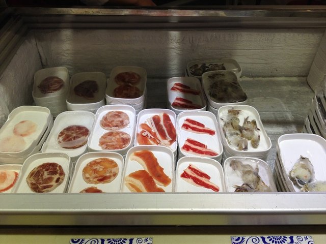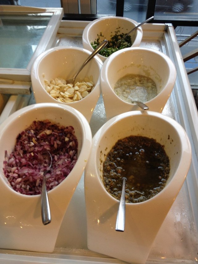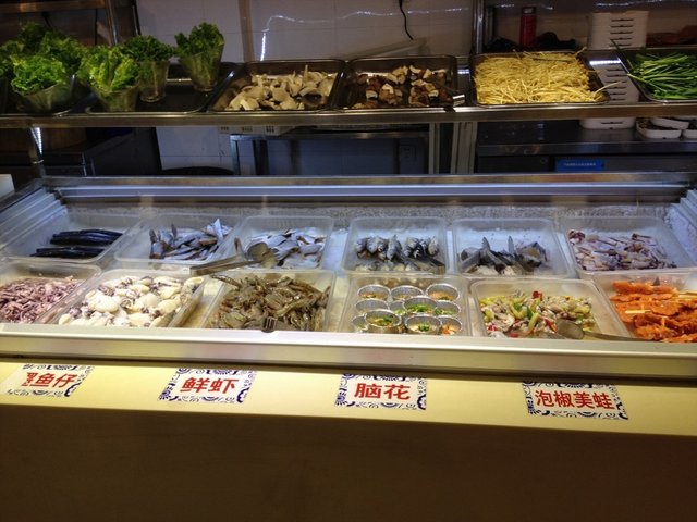 调料区:有三种蘸酱,边上还放了不少配料,另外有酱油等调料,可以自已DIY,