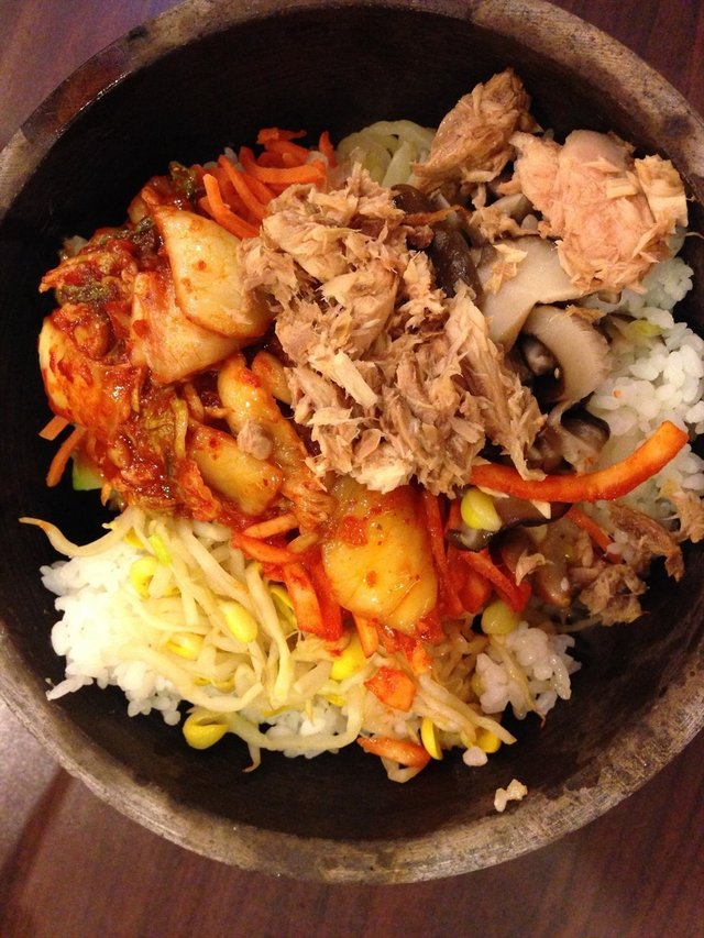 崇文门搜秀城八层搜秀美食城的正一味,可以用团购券,和朋友一起去的,我点的就是这个金枪鱼石锅饭,以前也经常去正一味吃东西但是没有点过金枪鱼的,价格还比别的要贵一些。端上来的时候看着还是赏心悦目的,尤其泡菜的颜色更是漂亮也是提味的,结果吃第一口的时候觉得这个金枪鱼好凉啊,一想应该是冷藏的吧,但是这个大大的影响了口感,总觉得味道不是那么的好吃,好在底下的石锅够热够结实,把米饭搅拌一下菜还温了一些,可能之前希望很大所以有失望吧。