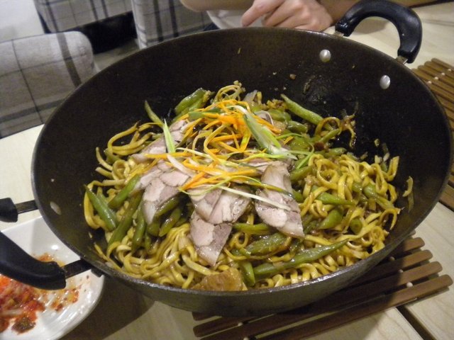 我们点了肘子的扁豆焖面,很快上了七个小菜,焖面则要稍微花一点时间,感觉味道还是可以的,北方人都是认这个东西的,豆角也焖的很烂,面条比较粗,但是直接上了一个锅,需要边吃边盛。