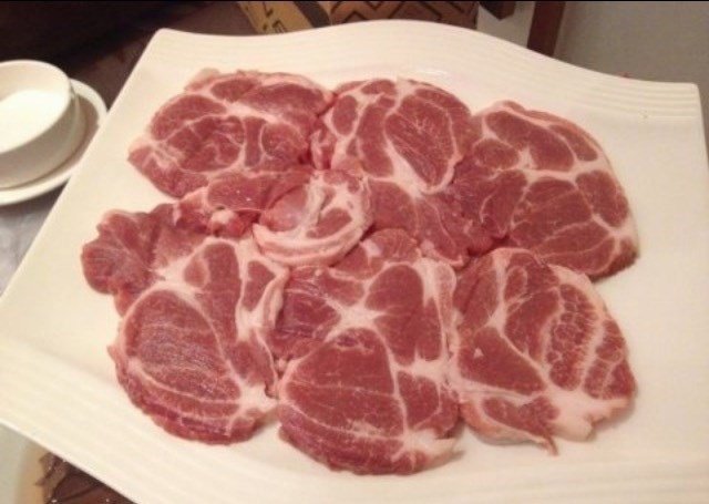 看到这大盘你就会误会是不是进了韩式烧烤店,五花肉大片的,肥瘦相见,关键是煮好了以后塞进嘴巴里面好爽啊。