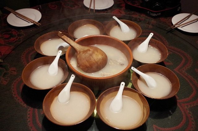 最先上来的是鸡汤。器皿特别。木勺木碗。非常的原生态。鸡汤也是香浓厚重。