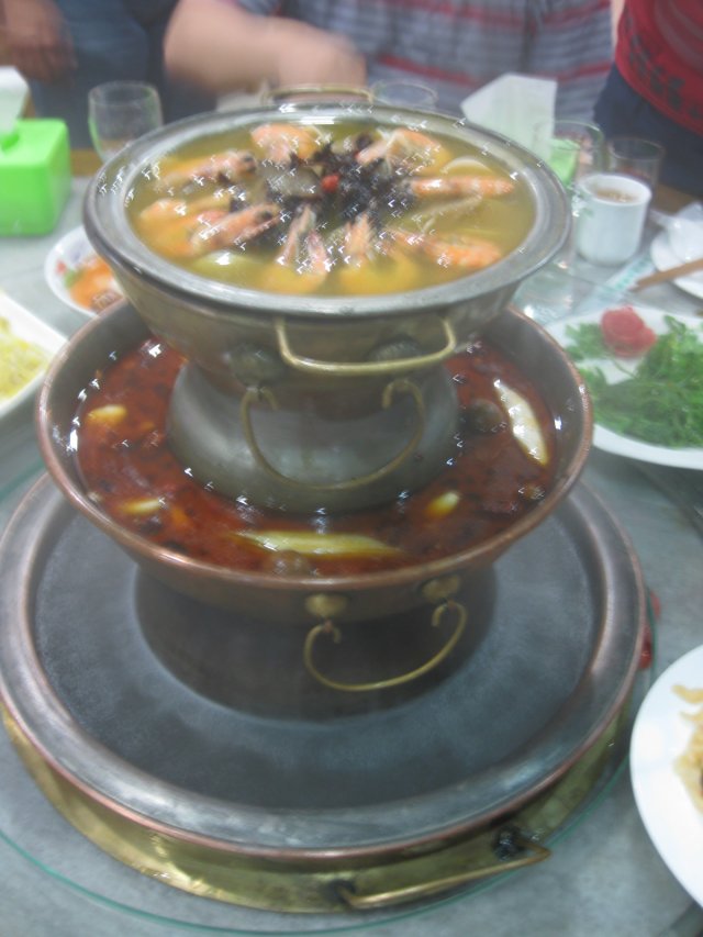 今天吃的是三层的锅,底层是清汤锅,中层是辣锅,顶层是融合了海参、虾、贝的海鲜锅,那汤喝起来满是海鲜的味道,很是鲜美。