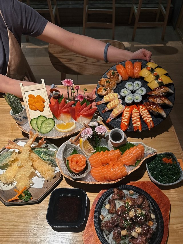 最有名的鮭魚,叫做“大滿座刺身”,鮮嫩多汁,絕對不會錯!扇貝和海膽都非常鮮甜,天婦羅的麵糊也不會太厚,一撕就酥脆。配兩杯啤酒再適合不過了。