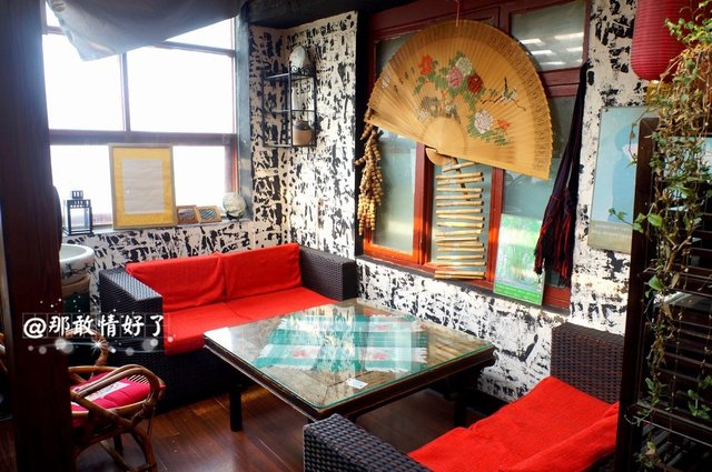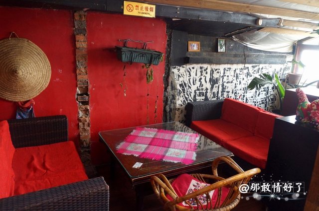 这次去我冲着这儿七拐八拐的私密性。进门有点儿幽暗,左手边是照片墙,民族风情的人物,饰品.......上二楼是宽敞的大厅散座,也有类似卡座。里头还有一条长长的小空间,放了几张桌子。