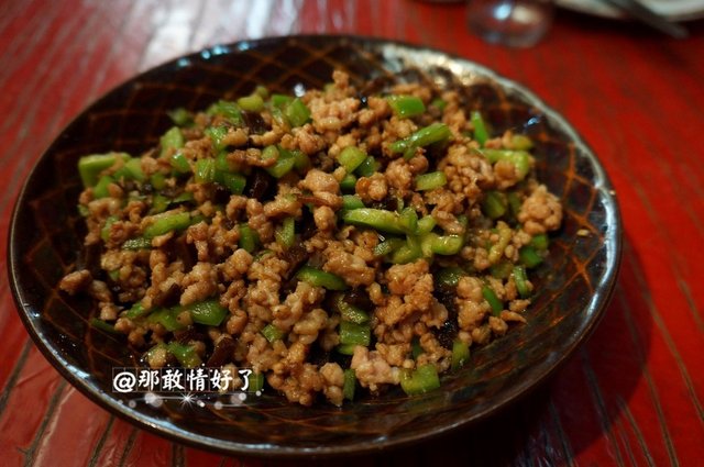 相较于红三剁,我喜欢吃黑三剁,因为前者是西红柿丁儿,做好的菜水分比较大,后者是云南大头菜,没有那么多水分,也更有嚼劲儿。是道很下饭的菜,猪肉沫、青椒,颜色漂亮,口感丰富。价格好像是22,具体几道菜全忘了