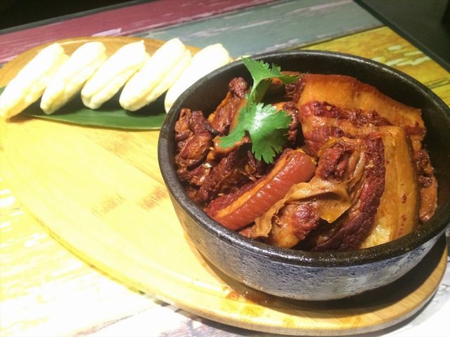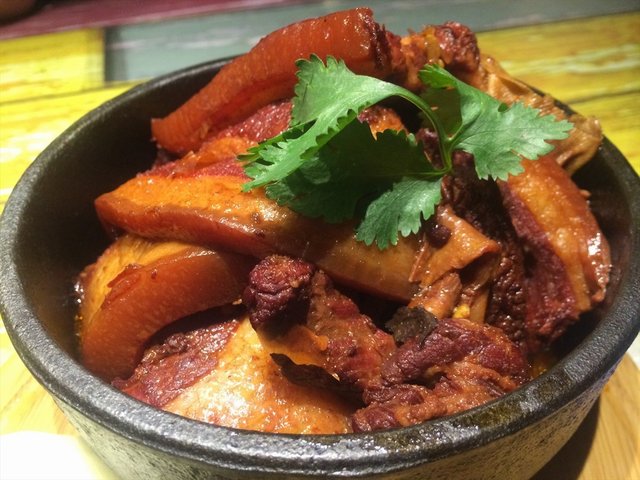 家乡香,小份38米。庆幸自己点了小份的,实在是太实在了好不好,不过这肥肉冒是无福消受啊•••用小饼夹了块瘦肉,味道果真很家常。值得一提的是不显山不露水的配菜豆皮卷,充分吸收了肉汁的味道,这货才是冒冒的爱啊~
